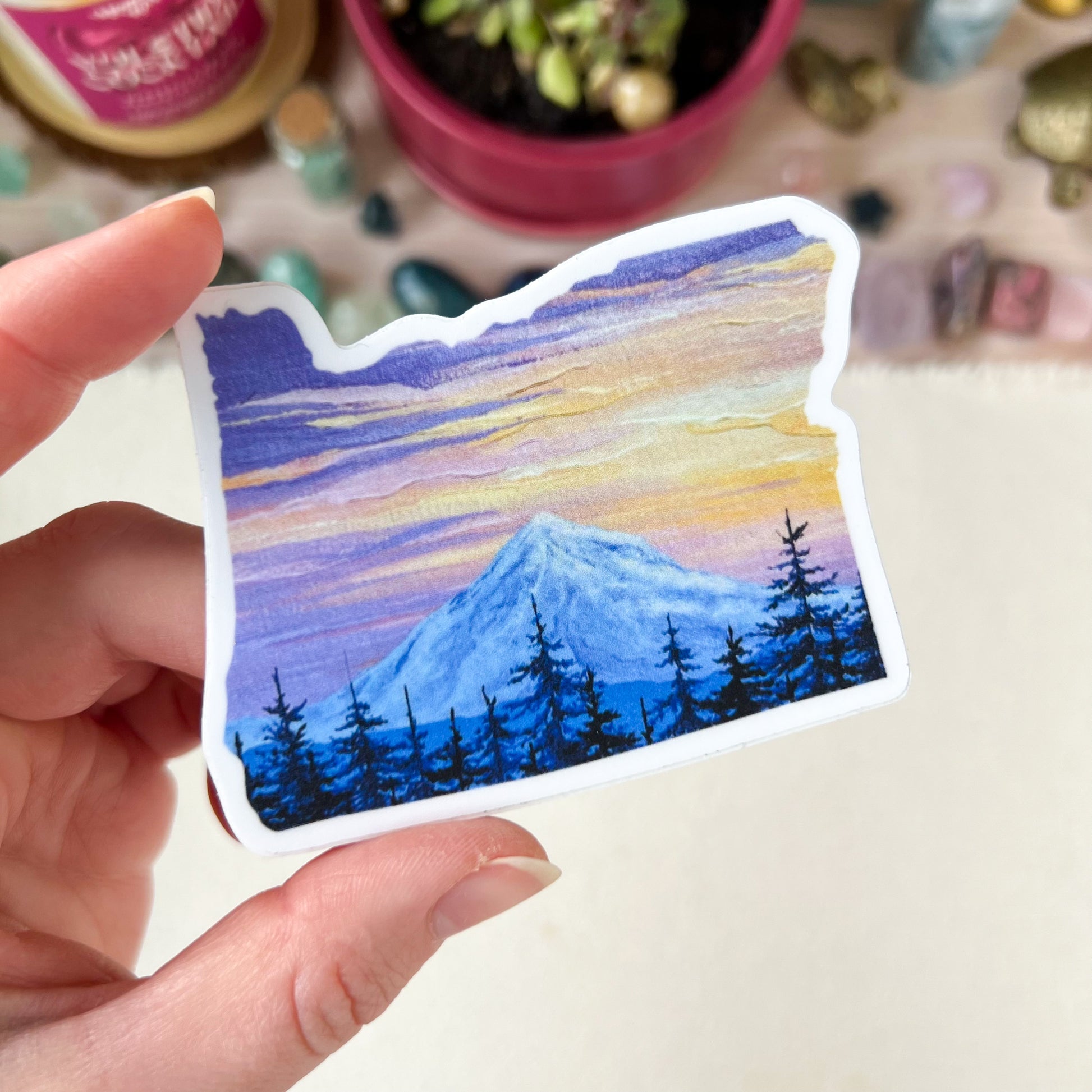 Die cut sticker in the shape of Oregon state depicting a sunrise over Mt. Hood.
